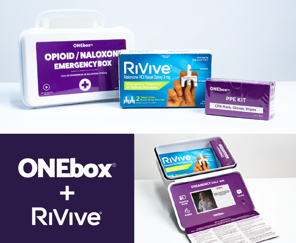 The ONEbox provides on-demand, one minute emergency video instruction, in both English and Spanish, that guides responders and laypersons through bystander intervention for naloxone administration and overdose response. The kit can be displayed in areas where other first aid items are displayed in common areas, such as where you might find a fire extinguisher, defibrillator, or traditional first aid kit. The box is intended to hold a two dose twin pack of OTC RiVive® compassionate 3 mg dose intranasal naloxone, although shipment of the RiVive product is handled by HRT and not WVDII when a purchase of ONEbox is made.